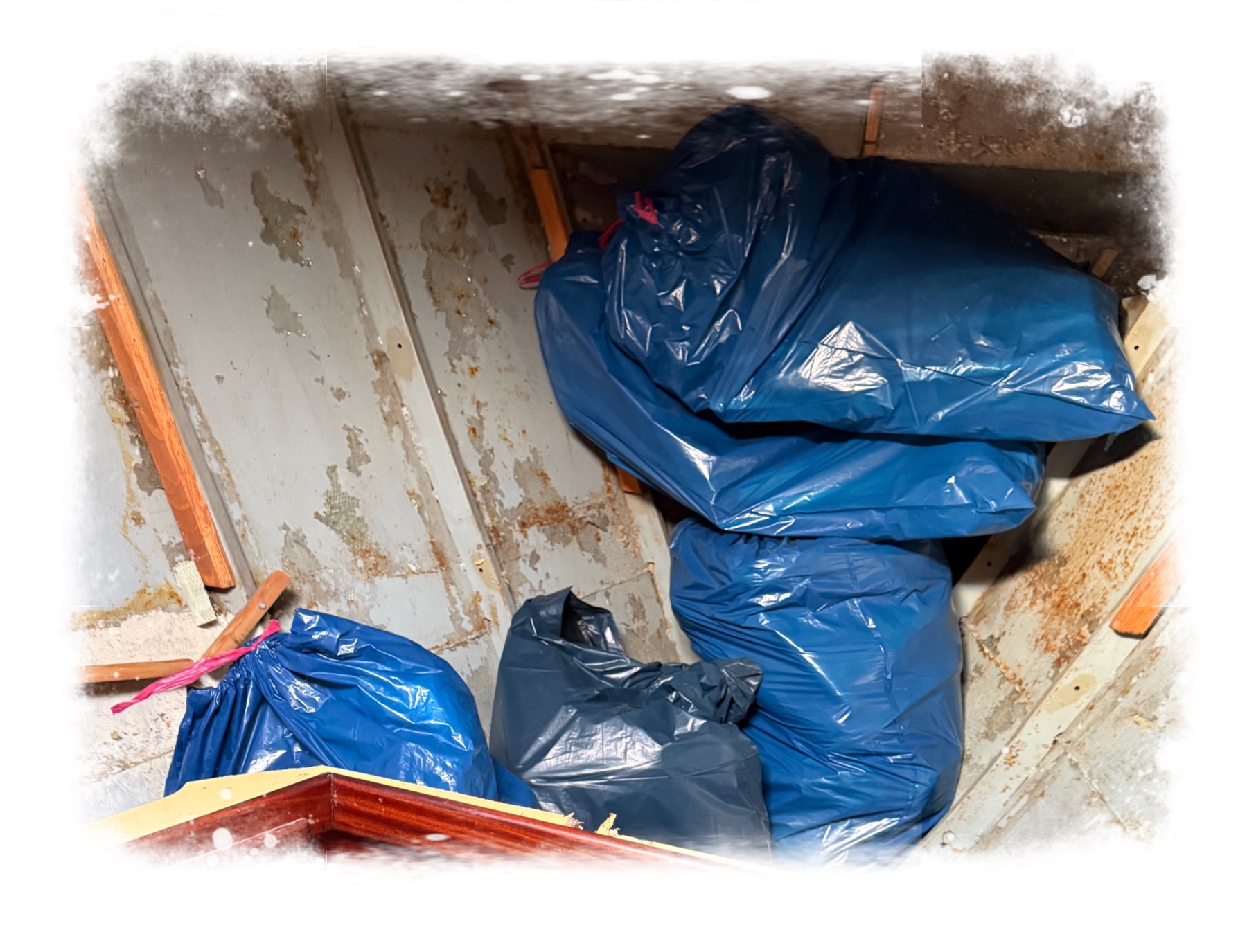Uns war jedoch schnell klar, dass wir mit Geduld und gutem Zureden hier nicht weiterkommen werden. Da passte es gut ins Konzept, dass wir eben diesen Bereich des Schiffes eh umgestalten wollen – und so durfte alles mal mit mehr, mal mit weniger Gewalt seinen Platz der letzten 20 Jahre räumen. Zu Tage kam eine erstaunlich gut erhaltene Decke und Bordwand. Lediglich eine etwas rostigere Stelle an der Decke und hier und dort ein wenig Flugrost an den Wänden kam zum Vorschein. Das finden wir – sehr gut! Insbesondere weil wir ja wissen, was uns am Kiel und in der Bilge noch erwarten wird. Da nehmen wir aktuell jeden Sonnenstrahl gerne mit…