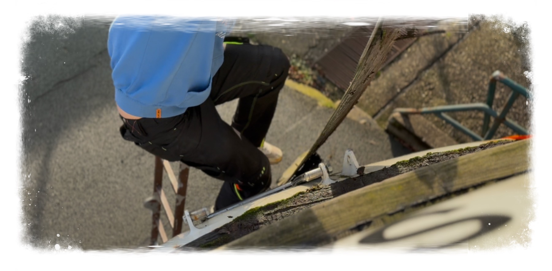 … der wird tief fallen. Genau genommen gute zwei Meter. Was war aber passiert? Ich hatte mir für dieses Wochenende noch vorgenommen, die (ehemals) Teakholz beschlagene Treppe Achtern von ihrem traurigen Holzrest zu befreien, immerhin ist dieser durch ständige Nässe sicherlich eher weniger gut für weniger Rost an der darunter liegenden Metallstruktur. Und so zog ich auf der Badeleiter stehend einmal kräftig an der ersten Holzleiste – die erstaunlich wenig Gegenwehr leisten wollte. Dabei war ergo die mathematische Formel zwischen Zugkraft meinerseits und der Widerstandskraft der Leiste nicht so ganz ausgewogen – mit dem Resultat, dass ich den Halt verlor und galant wie eine Katze in die Tiefe rauschte.